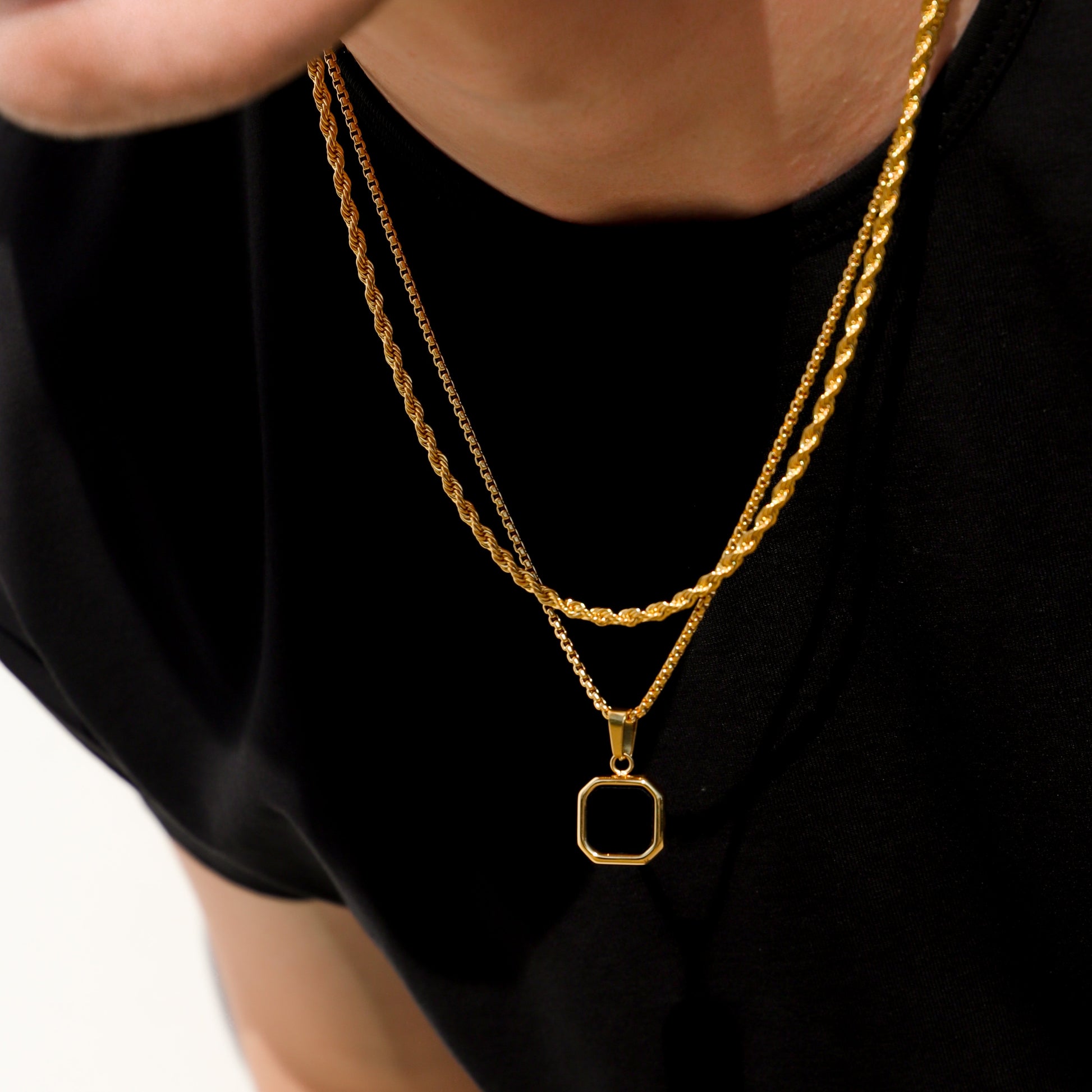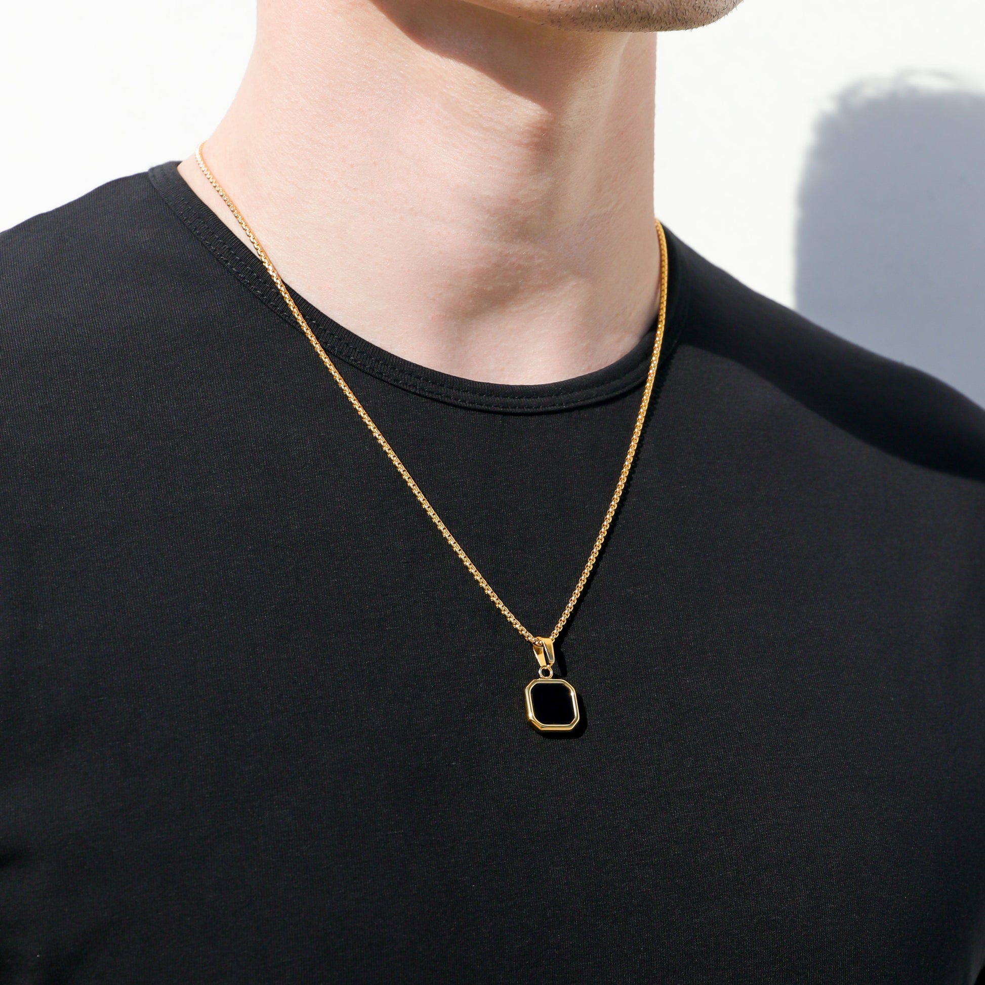 The black onyx stone pendant on a gold round box chain is a striking and sophisticated piece of jewelry. The pendant showcases a sleek and polished black imitation onyx stone, renowned for its deep black color and smooth surface. The stone is expertly set in a luxurious gold bezel, accentuating its elegance and creating a captivating contrast.
