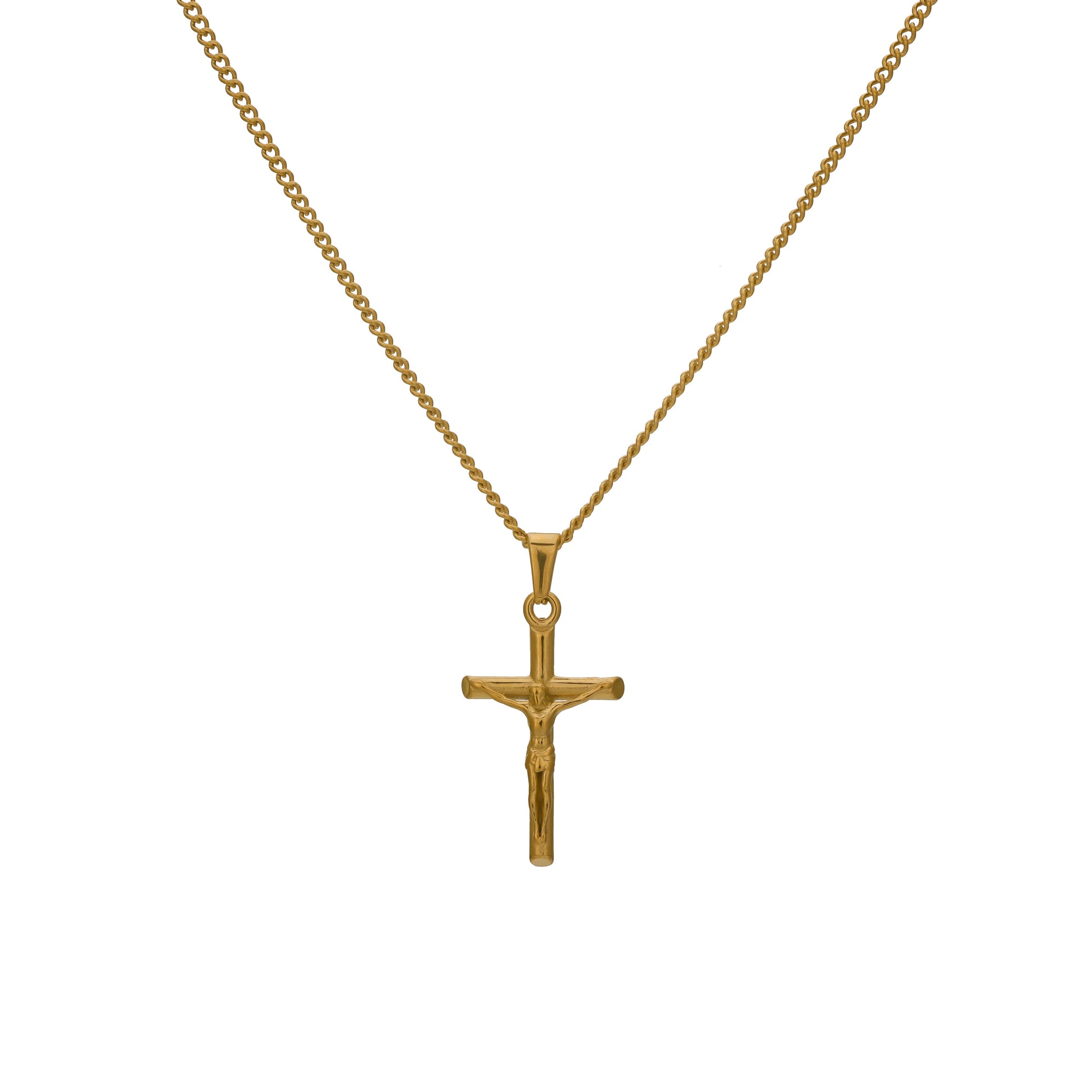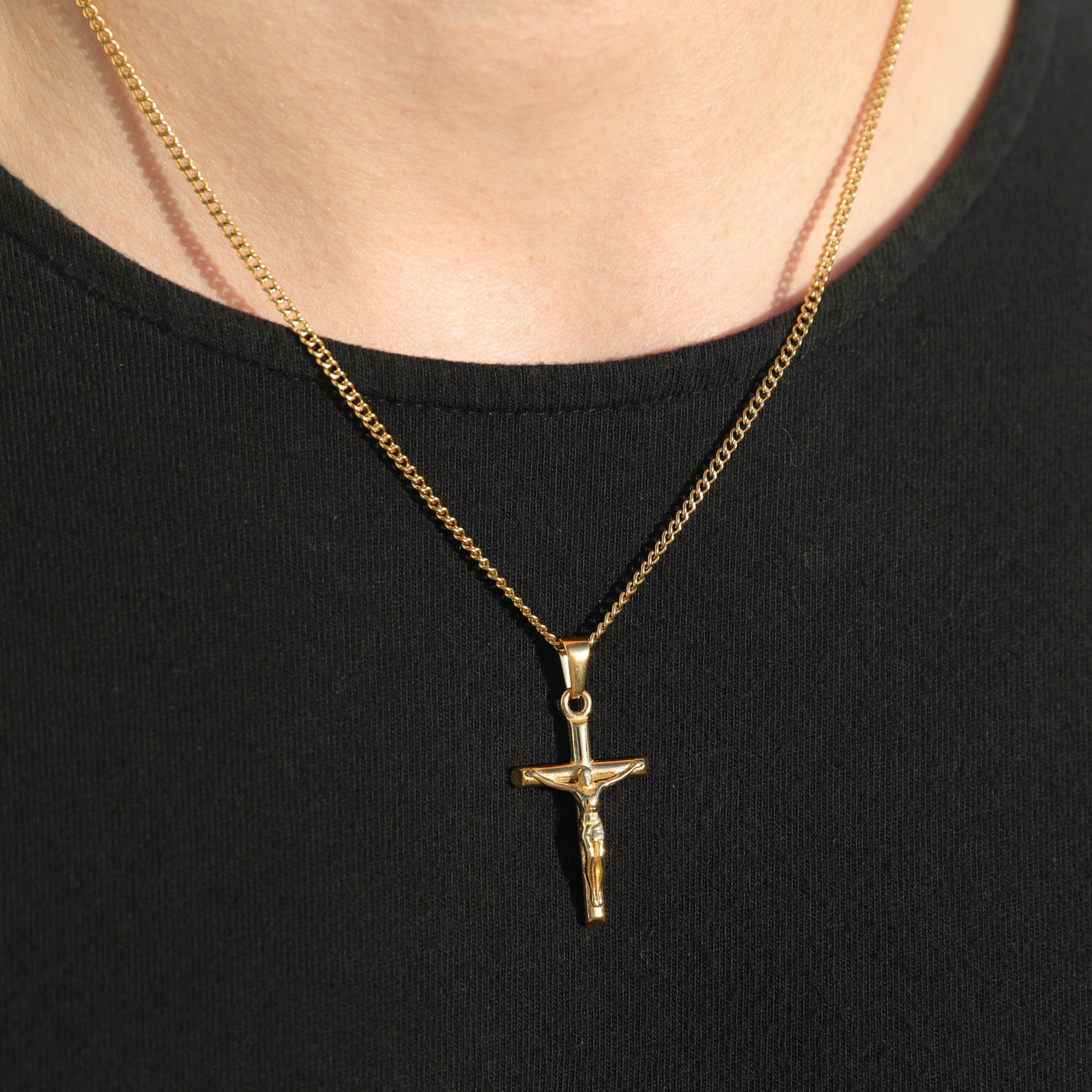 The stunning Gold Crucifix pendant, the perfect symbol of faith and devotion for any stylish man. This pendant features a classic, detailed image of Jesus on the cross, crafted in shining gold. The pendant hangs from a sturdy, matching gold chain, ensuring a secure and comfortable fit. Whether you wear it alone or layer it with other necklaces, this pendant is sure to make a statement and serve as a constant reminder of your faith. The Gold Crucifix pendant is a meaningful and timeless accessory, making it the perfect gift for yourself or someone special.