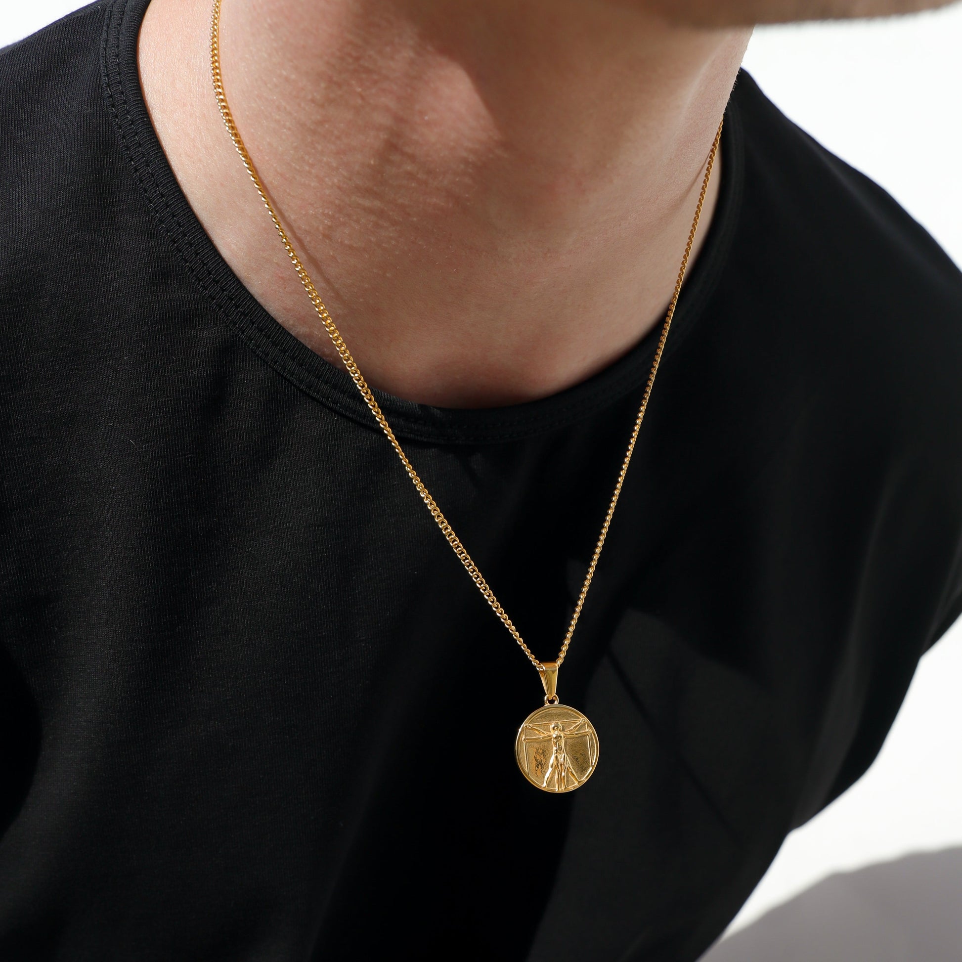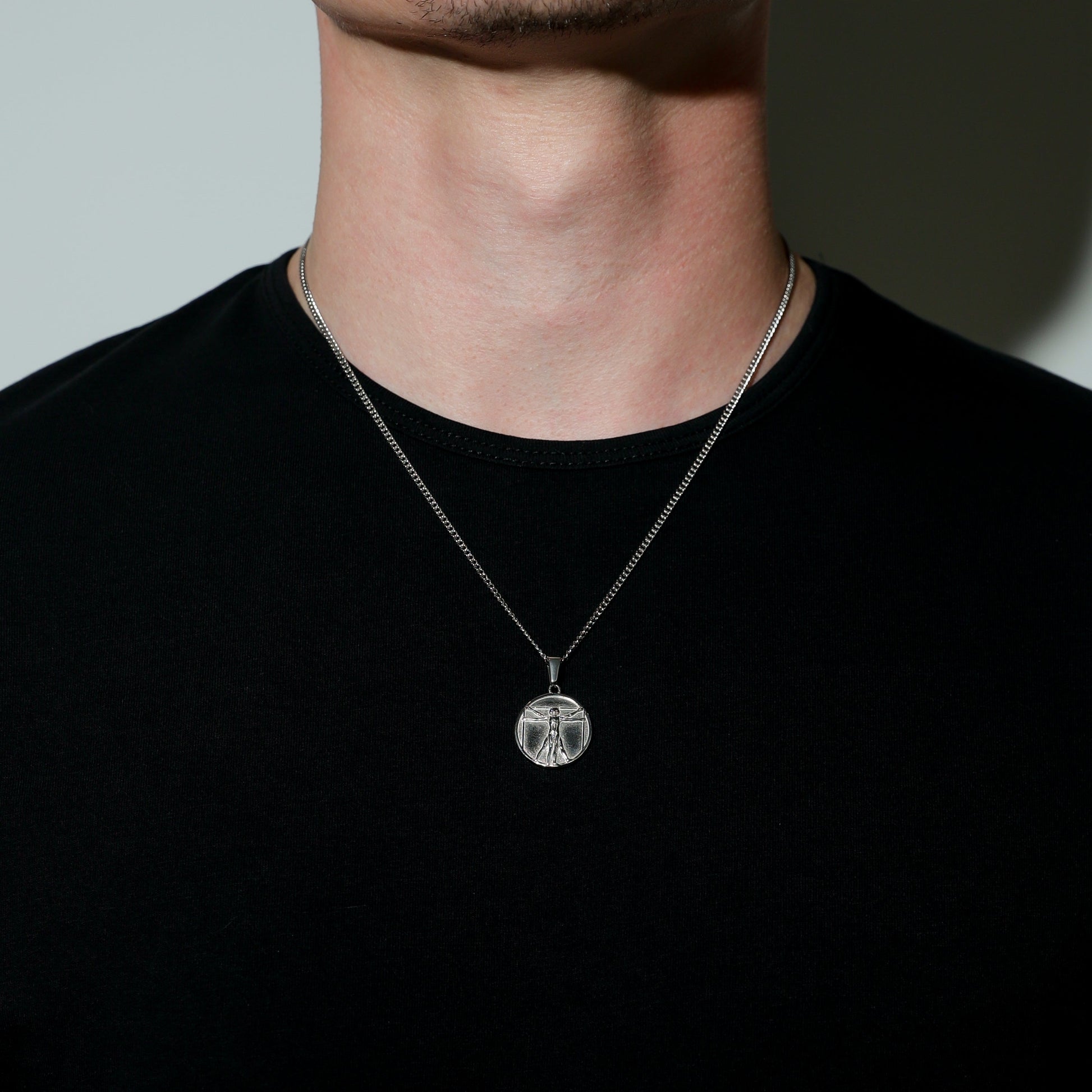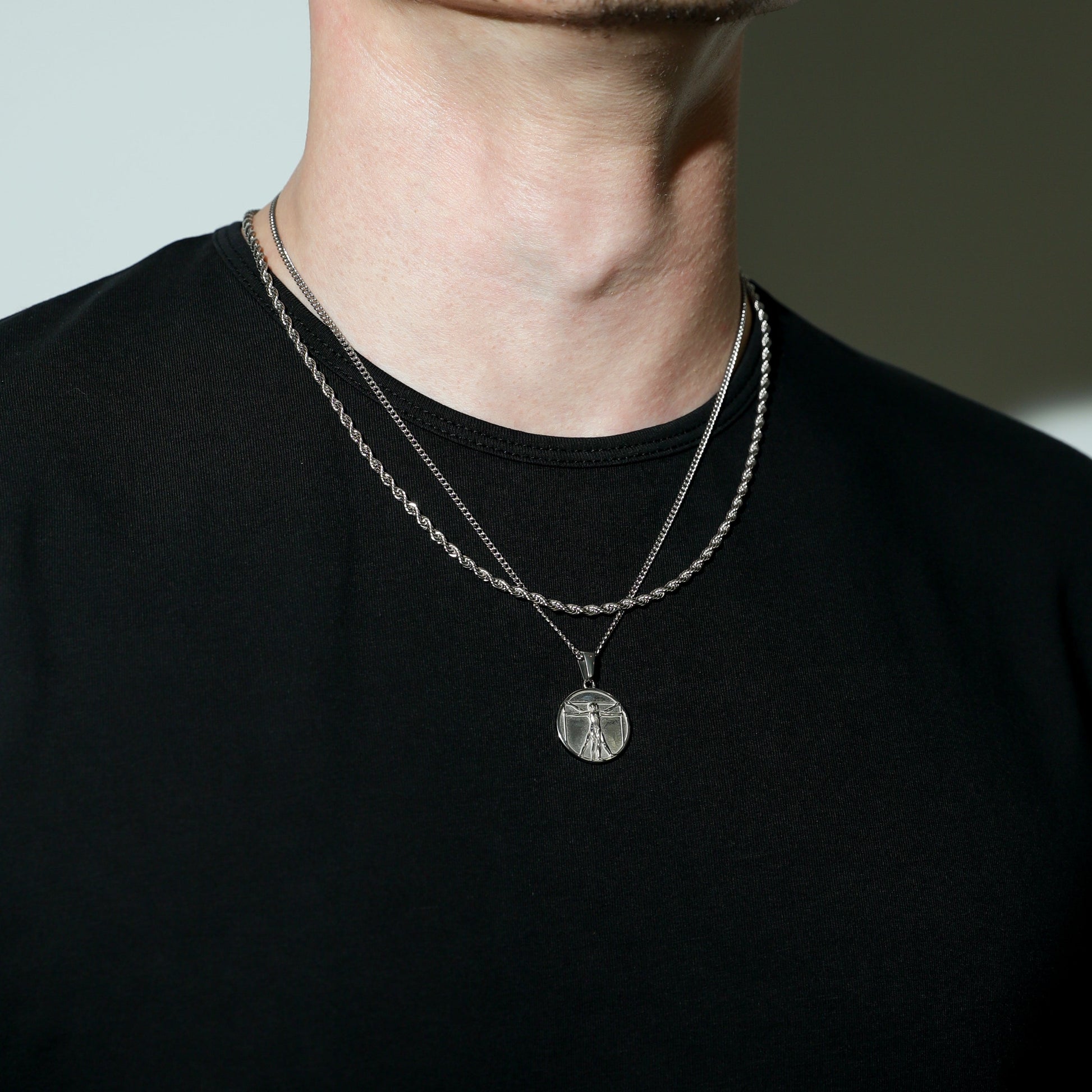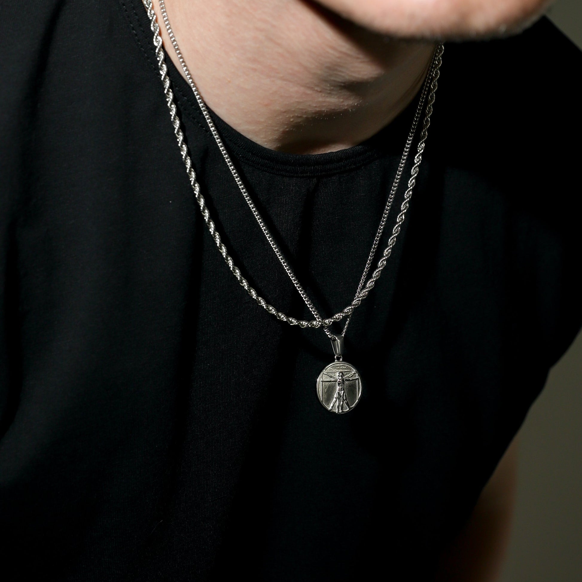 Our Da Vinci Vitruvian Man Pendant and Rope Chain are made from Premium quality 316L stainless steel. This allows the pendant and chain to be water and sweat resistant. This chain can be worn on its own as a statement or be layered with other chains from our shop.