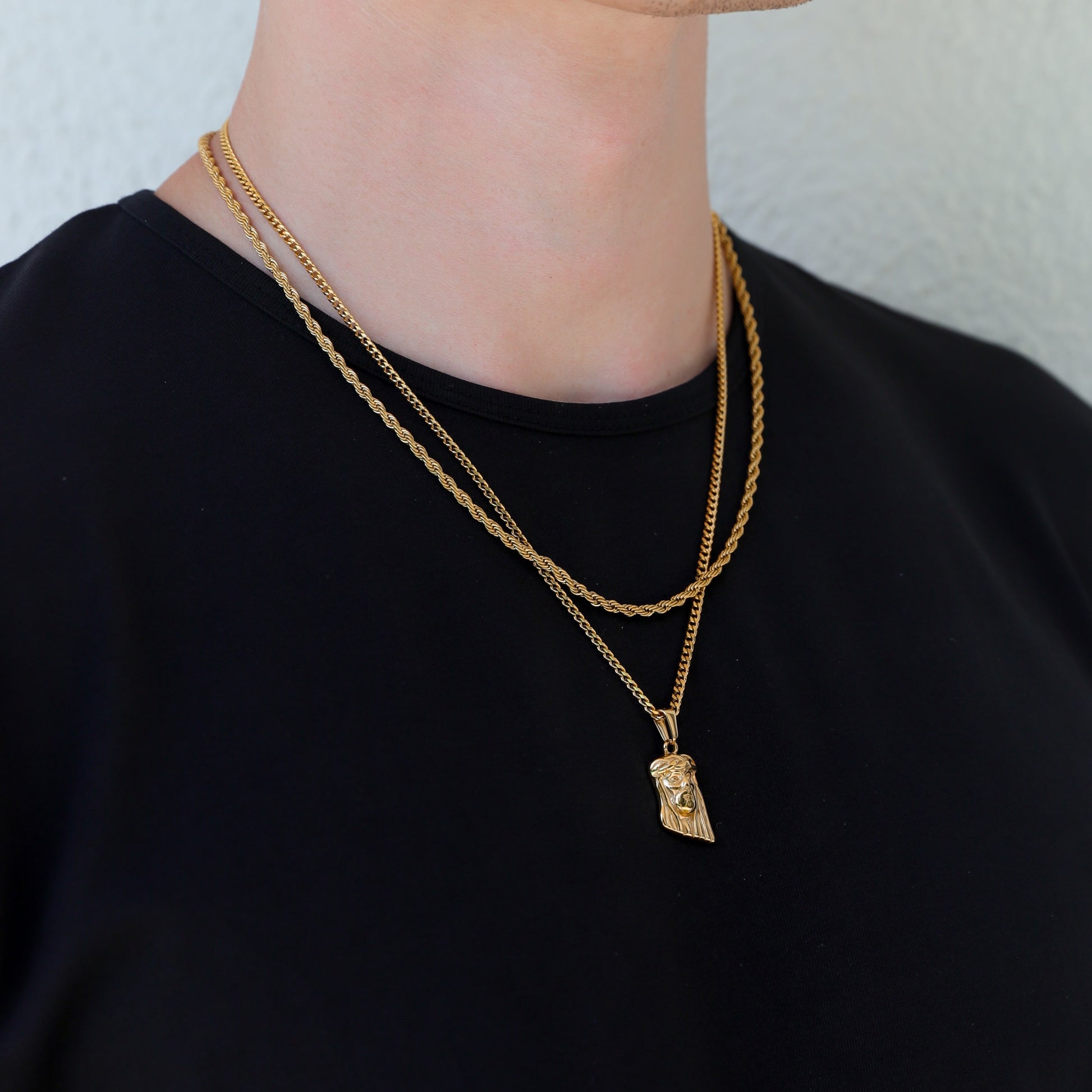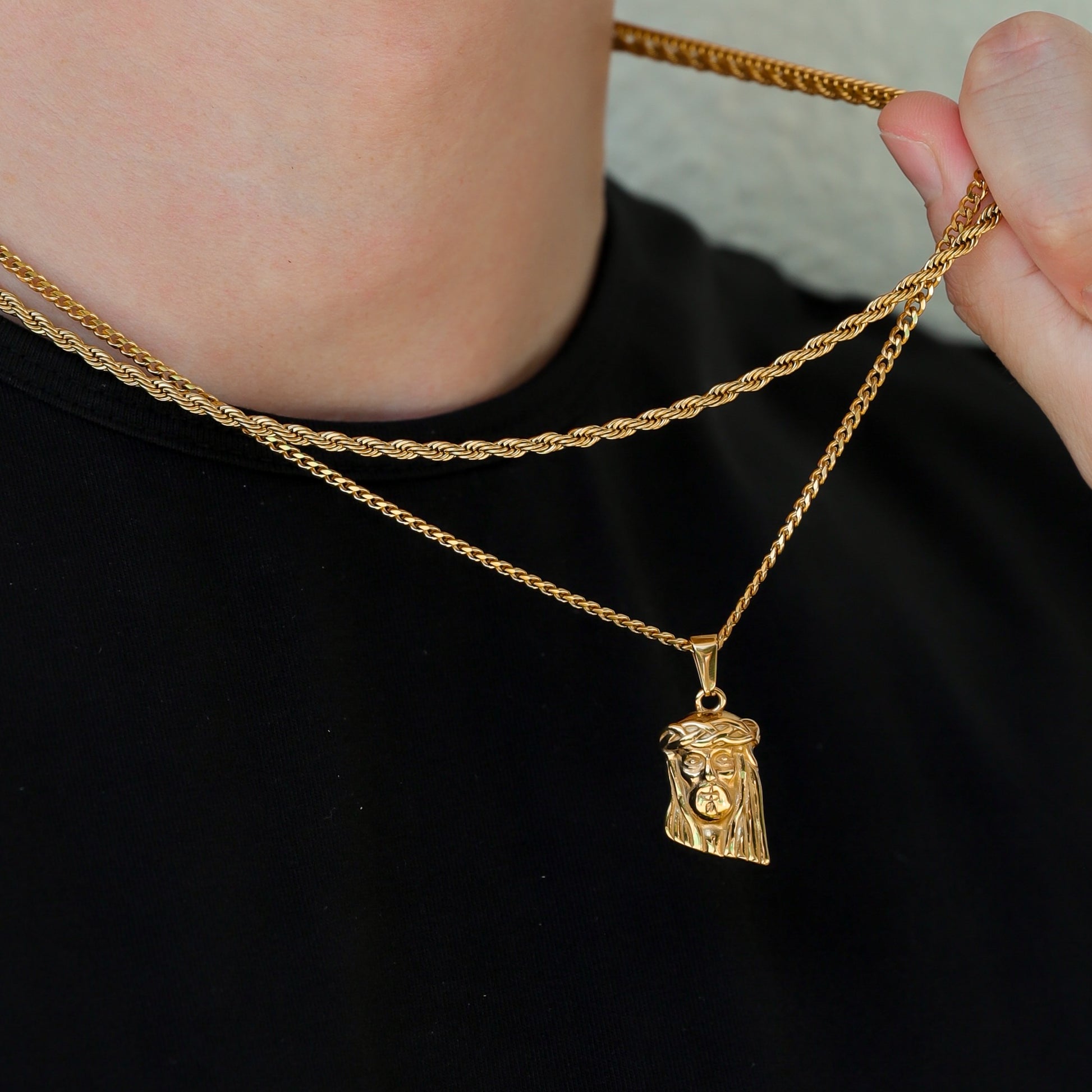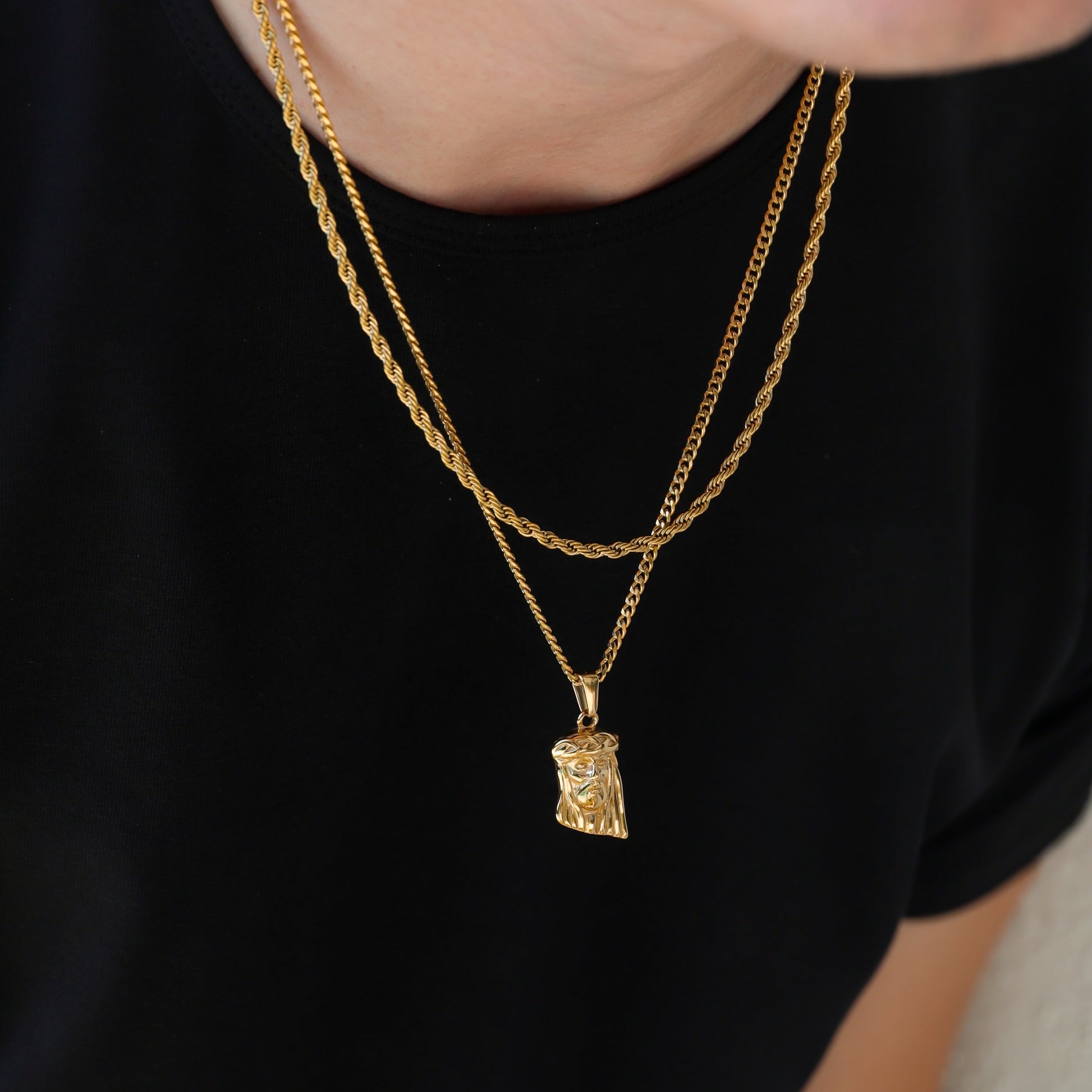 Our Jesus necklace and Rope chain are made from Premium quality 316L stainless steel. This allows the pendant and chain to be water and sweat resistant. This chain can be worn on its own as a statement or be layered with other chains from our shop.