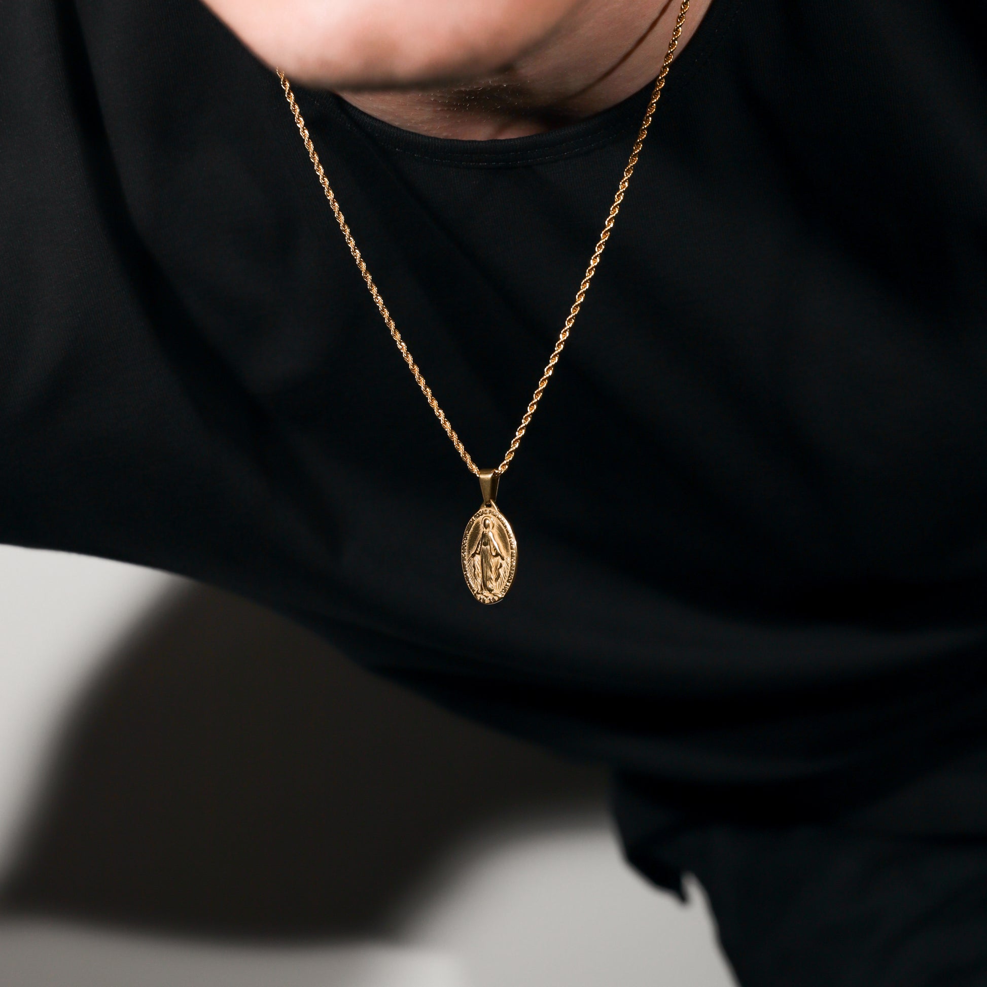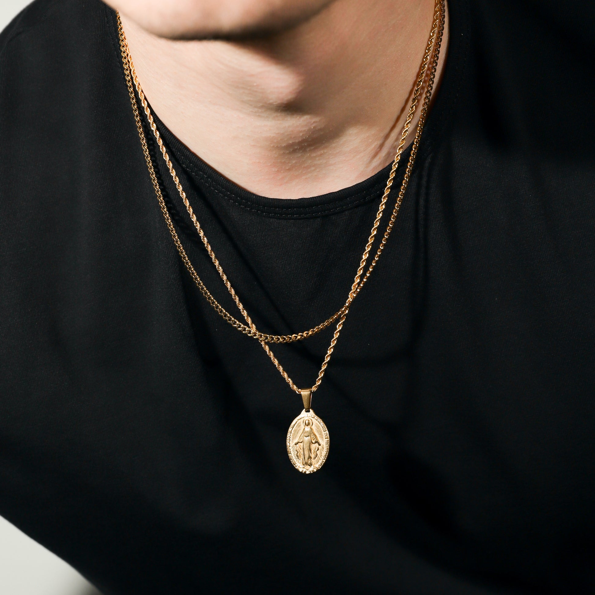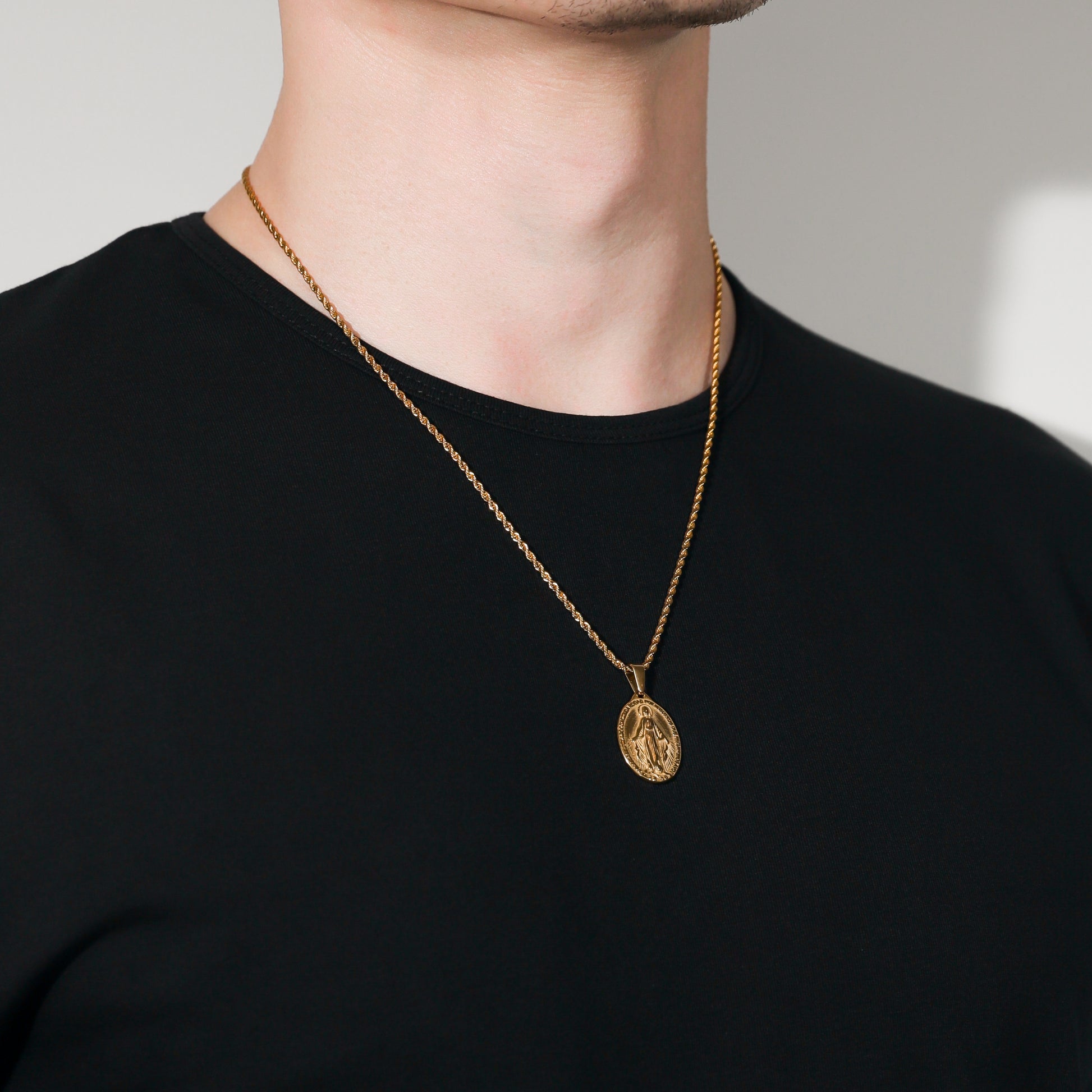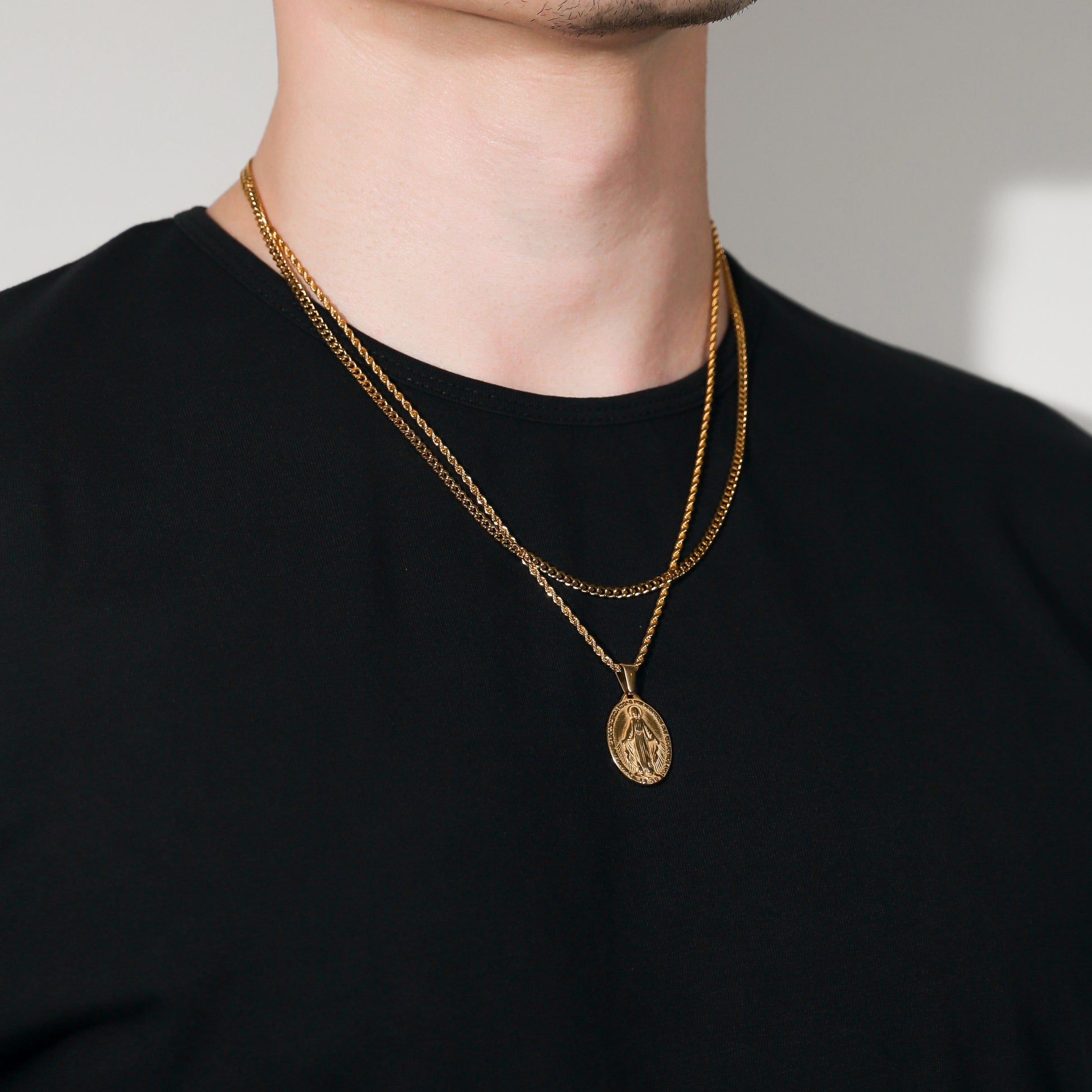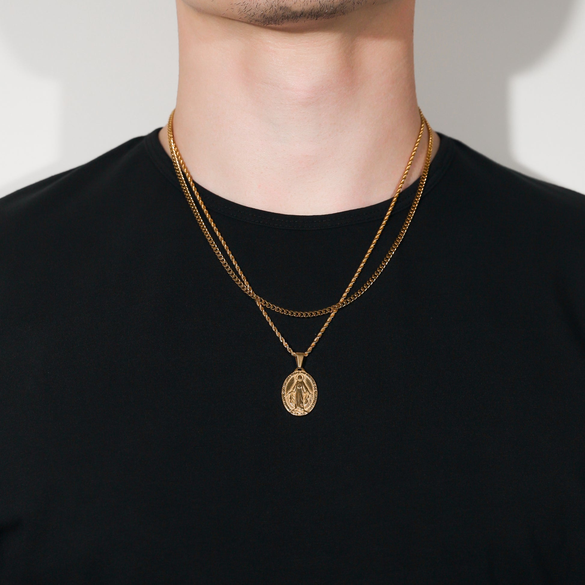 Our St. Mary pendant/medal is made from Premium quality 316L stainless steel. This allows the pendant and chain to be water and sweat resistant. This chain can be worn on its own as a statement or be layered with other chains from our shop.