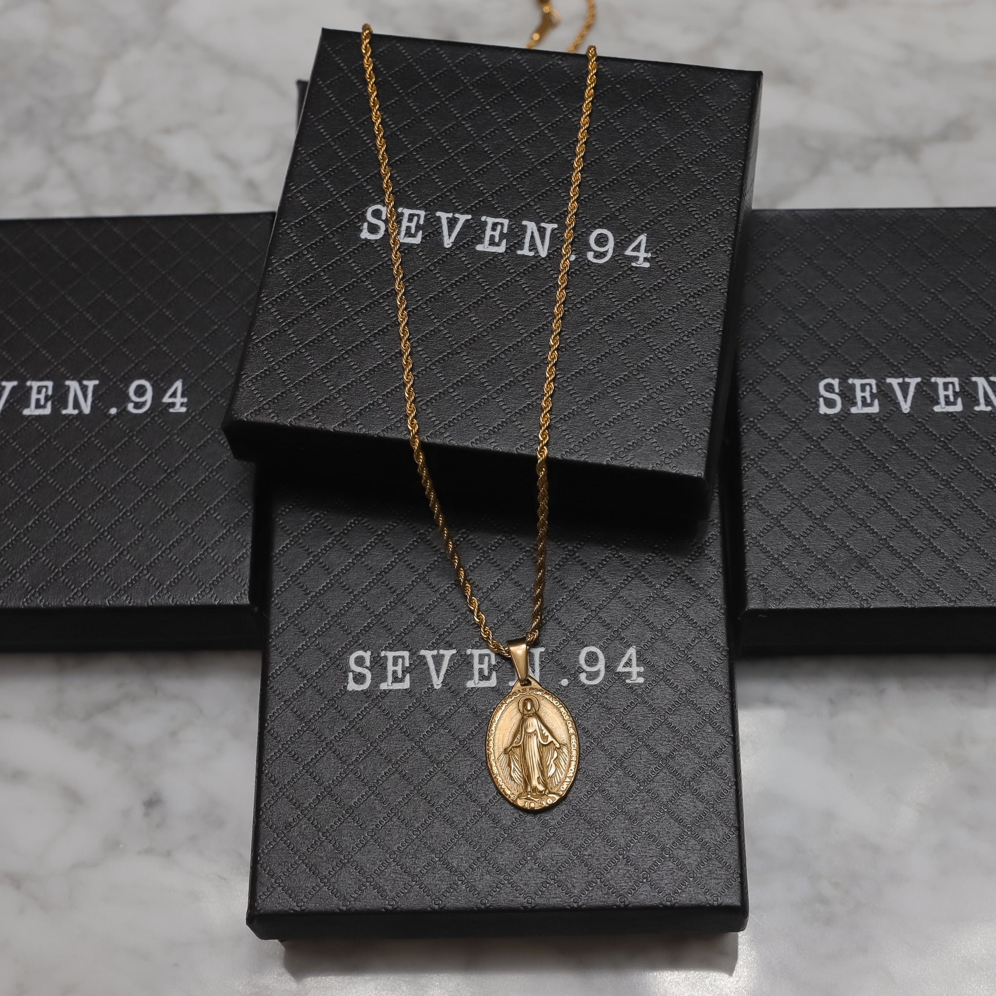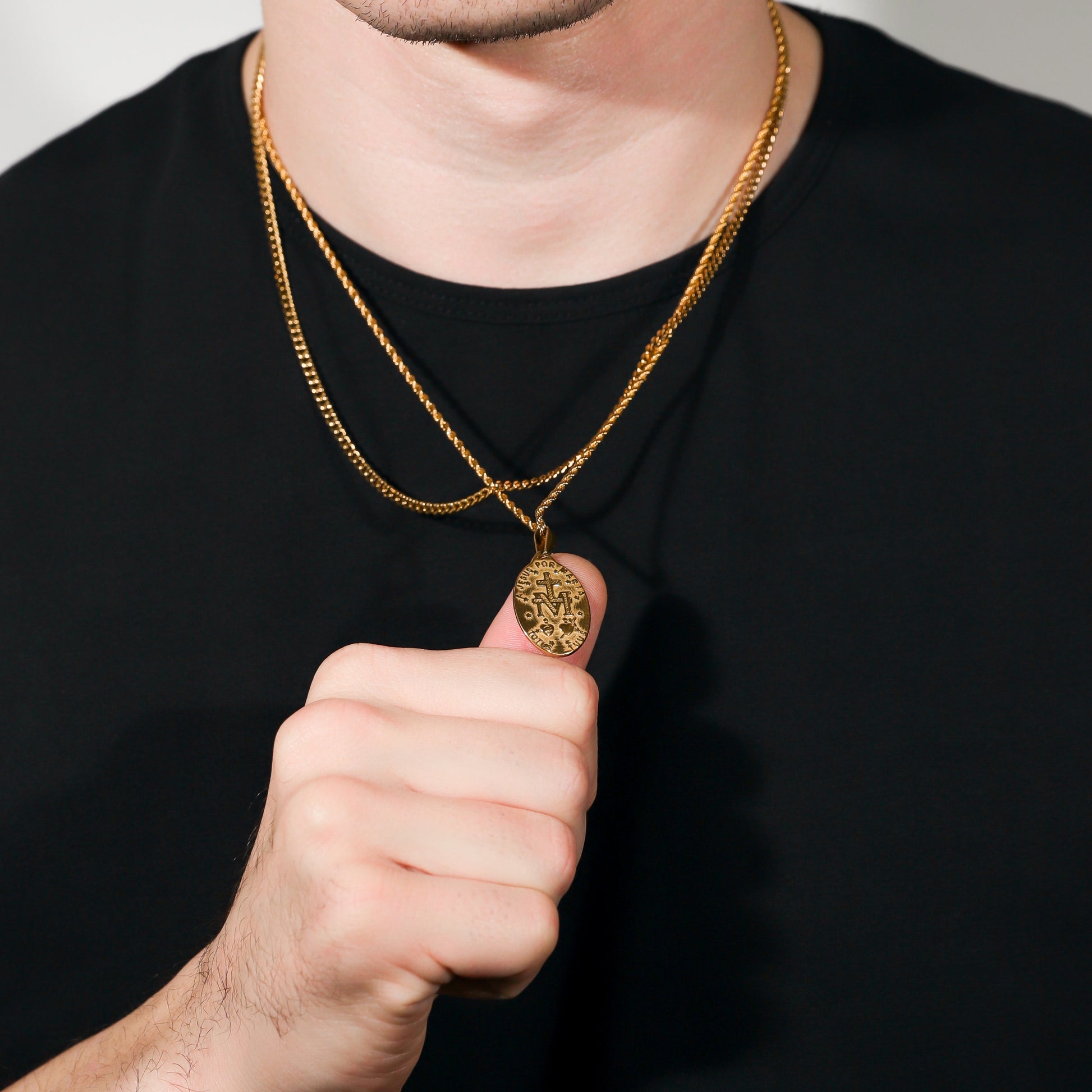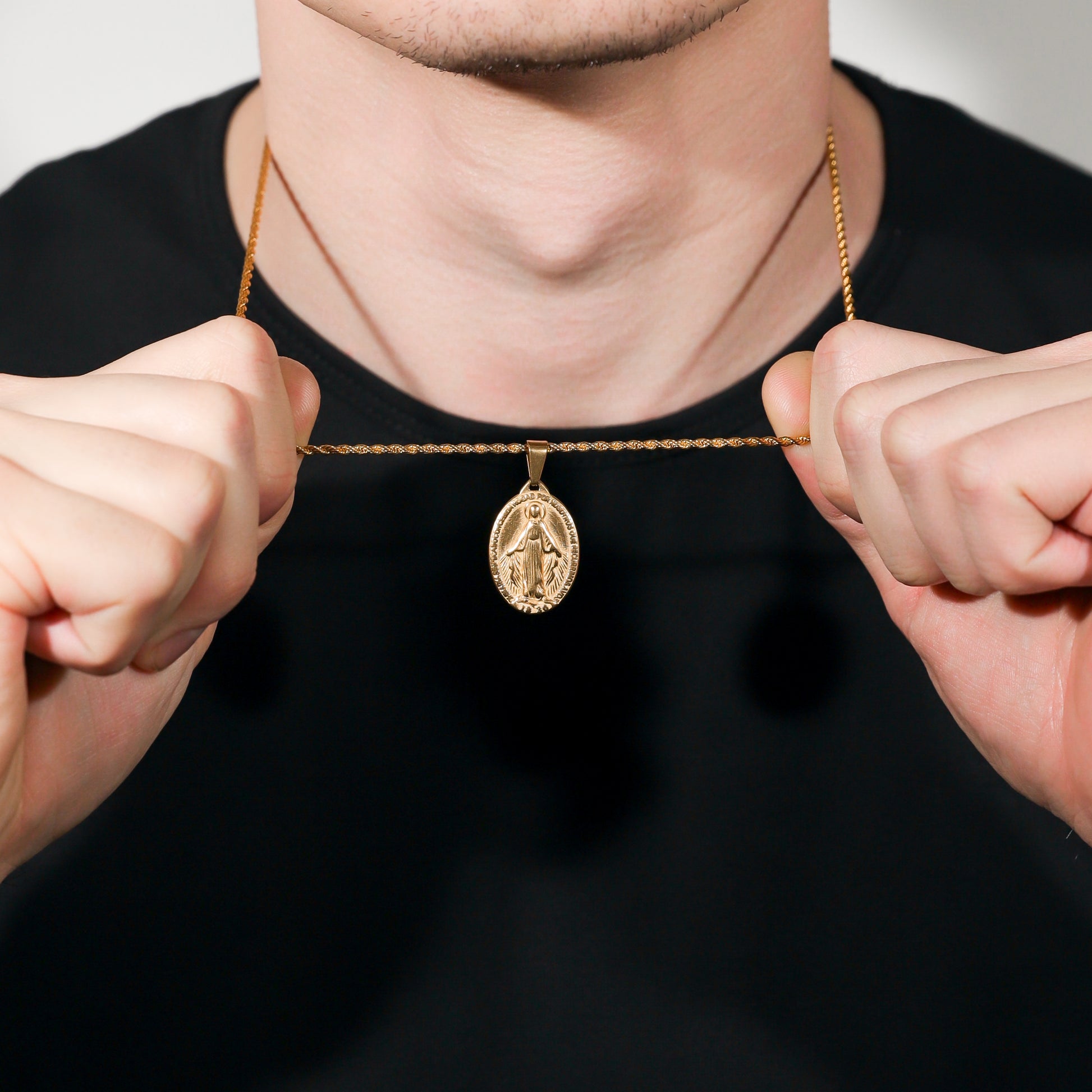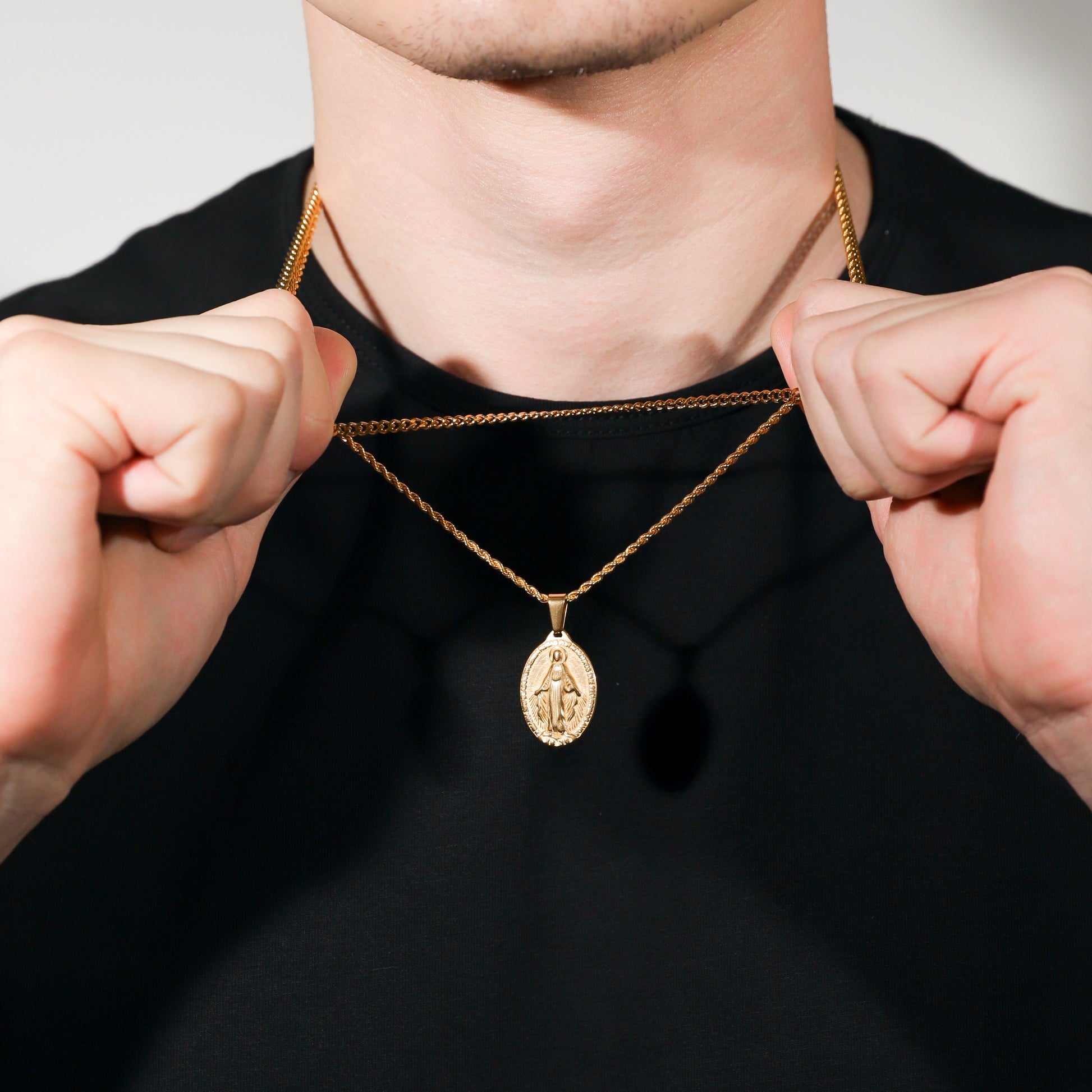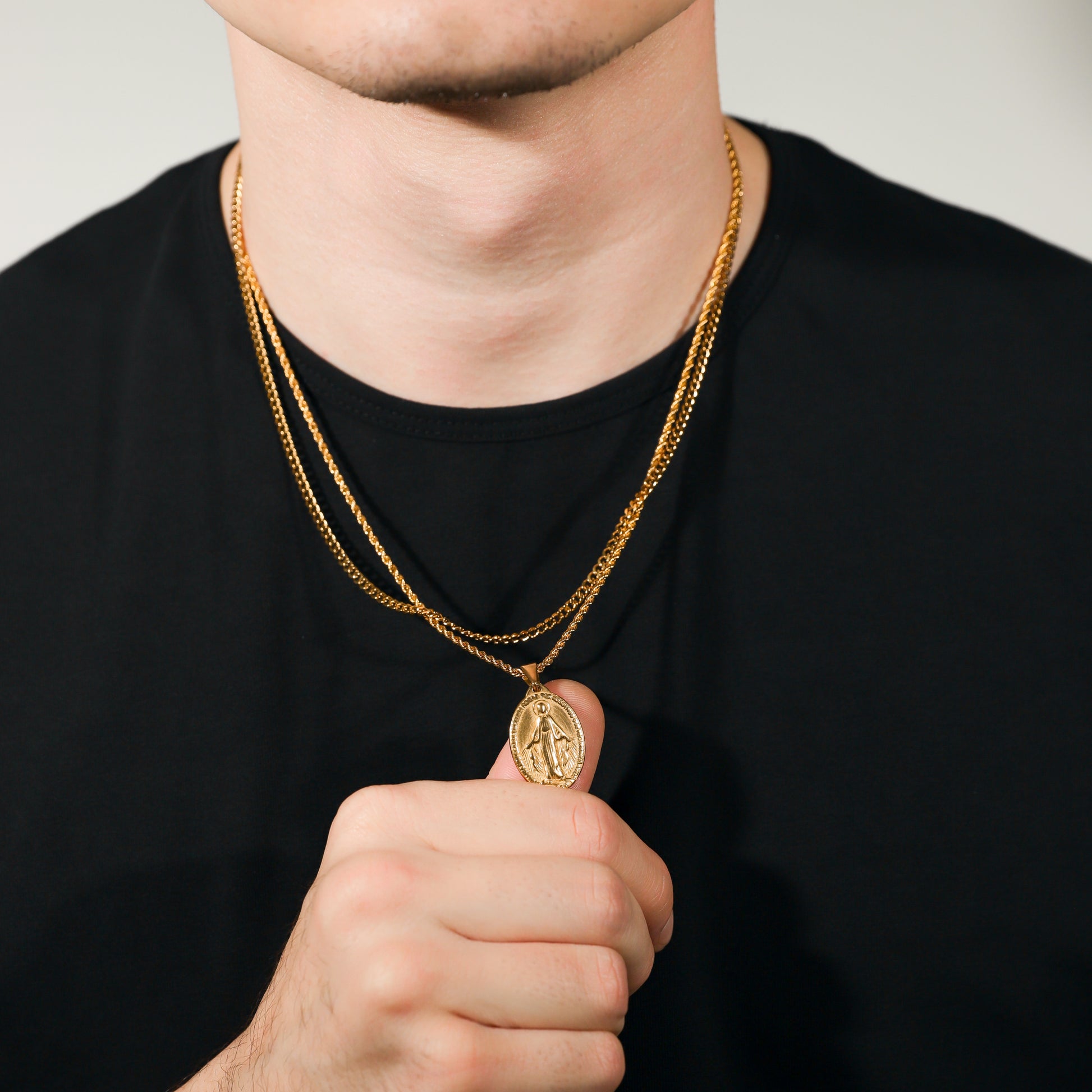 Our St. Mary pendant/medal is made from Premium quality 316L stainless steel. This allows the pendant and chain to be water and sweat resistant. This chain can be worn on its own as a statement or be layered with other chains from our shop.