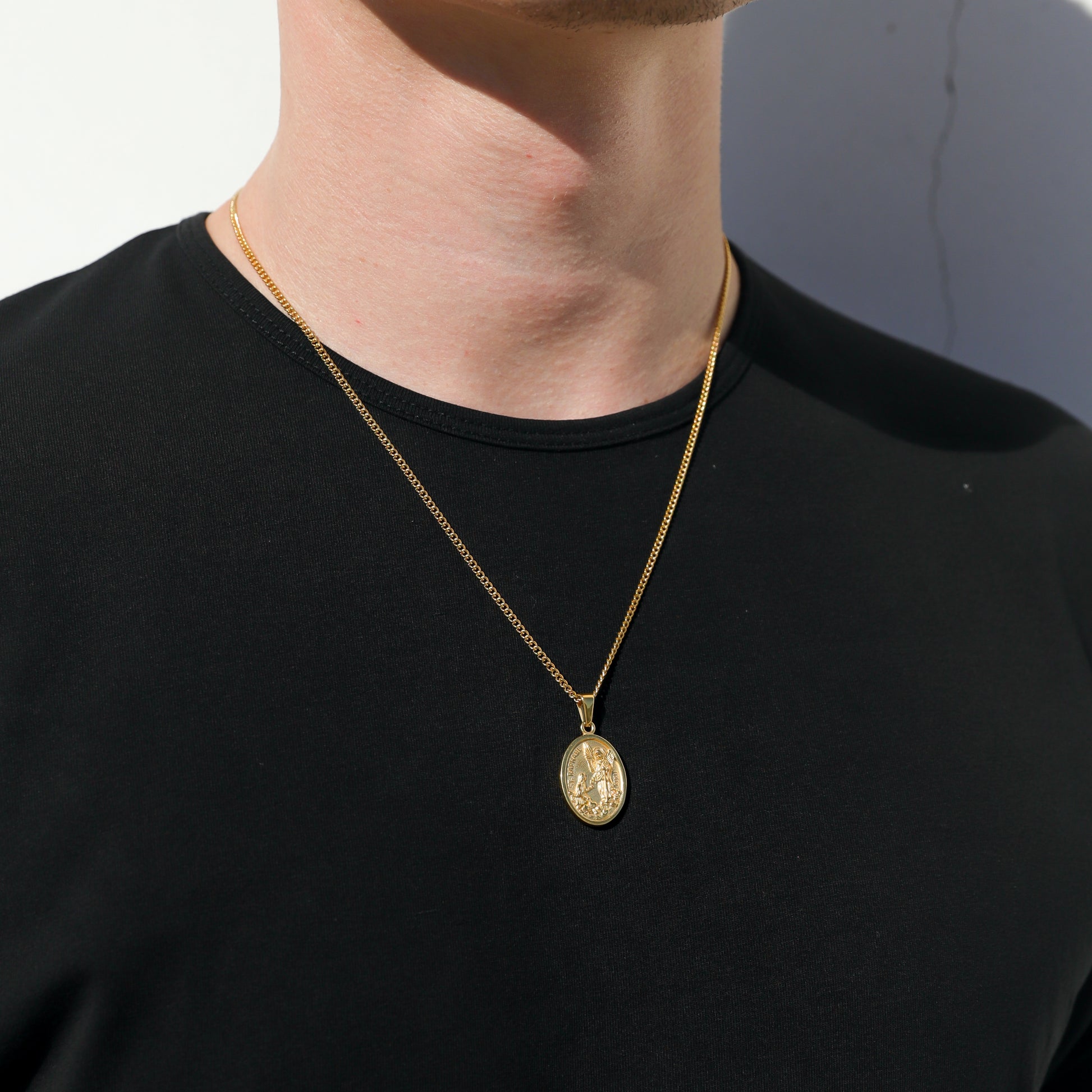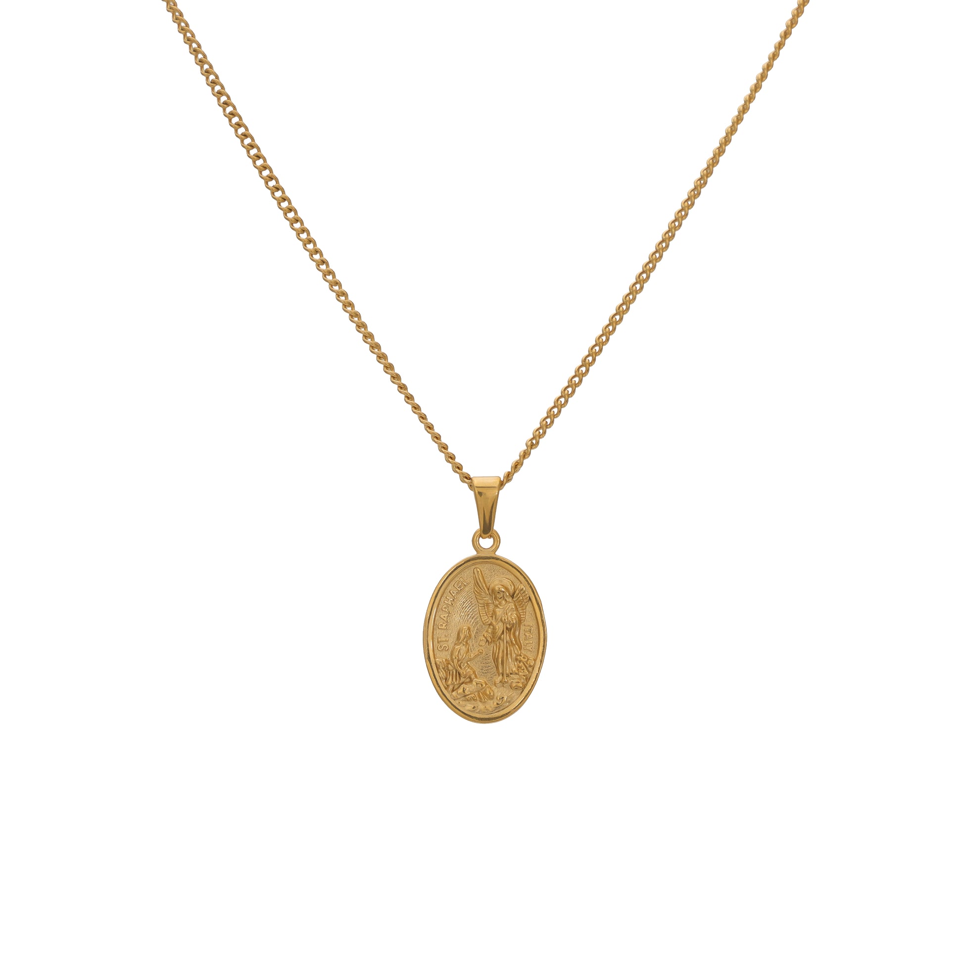 Gold St. Raphael pendant, designed for men who appreciate classic style and quality craftsmanship. The pendant features an oval shape with a detailed image of St. Raphael, the archangel and protector, in stunning gold. The intricate details of the image, including St. Raphael's figure and wings, are accentuated by raised edges. The pendant hangs from a sturdy, matching gold chain, ensuring a comfortable and secure fit. This pendant is perfect for adding a touch of sophistication and spirituality to any outfit, whether it's for everyday wear or a special occasion. It's a symbol of faith and protection, making it a meaningful gift for yourself or someone special.