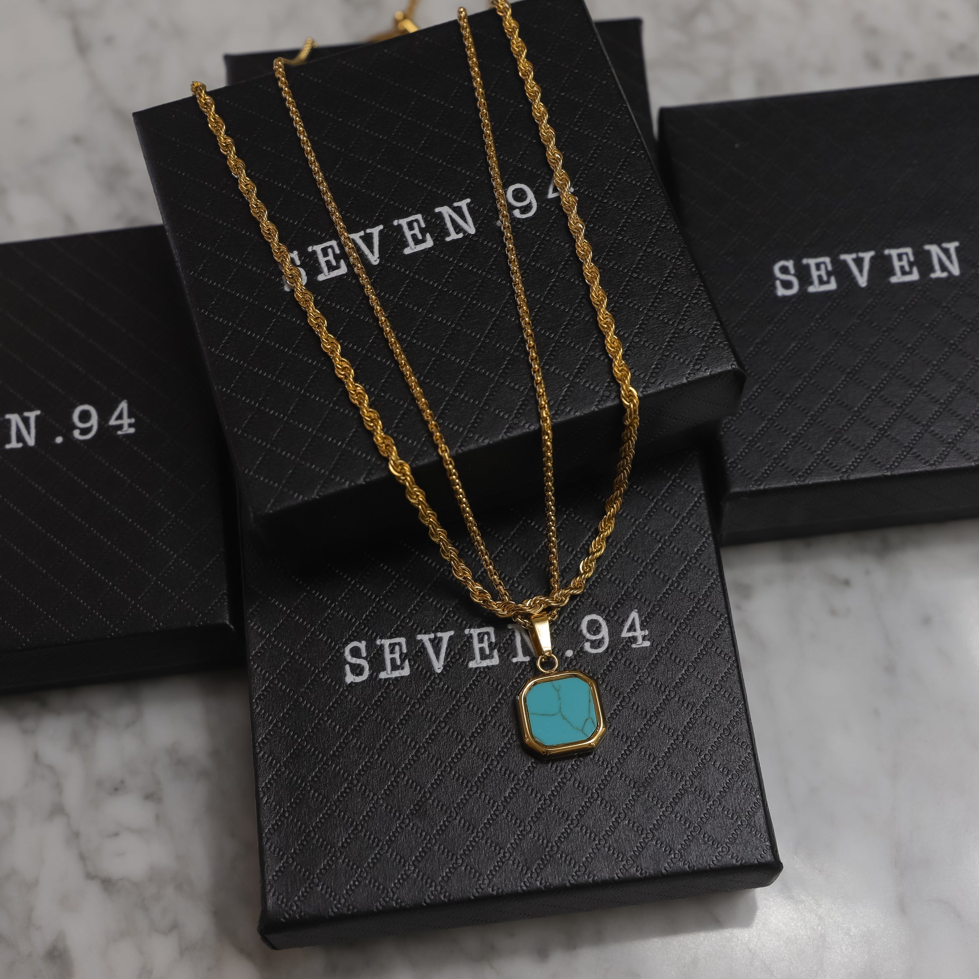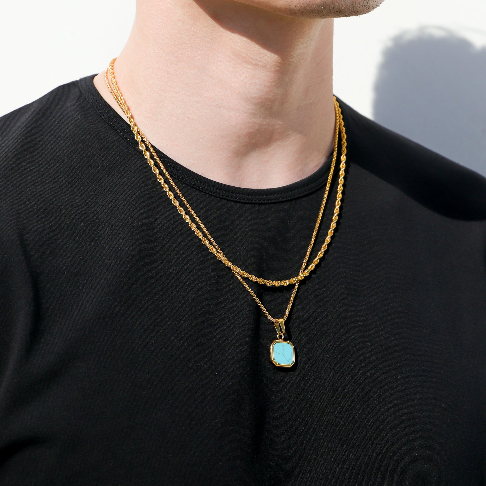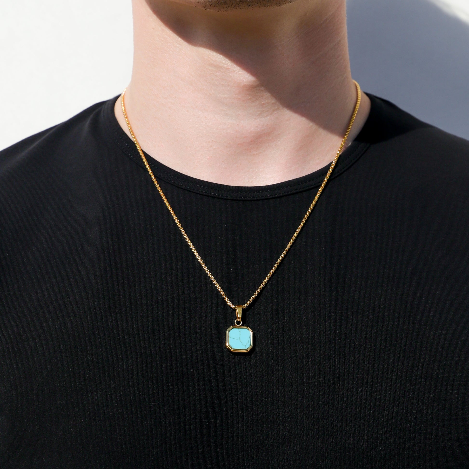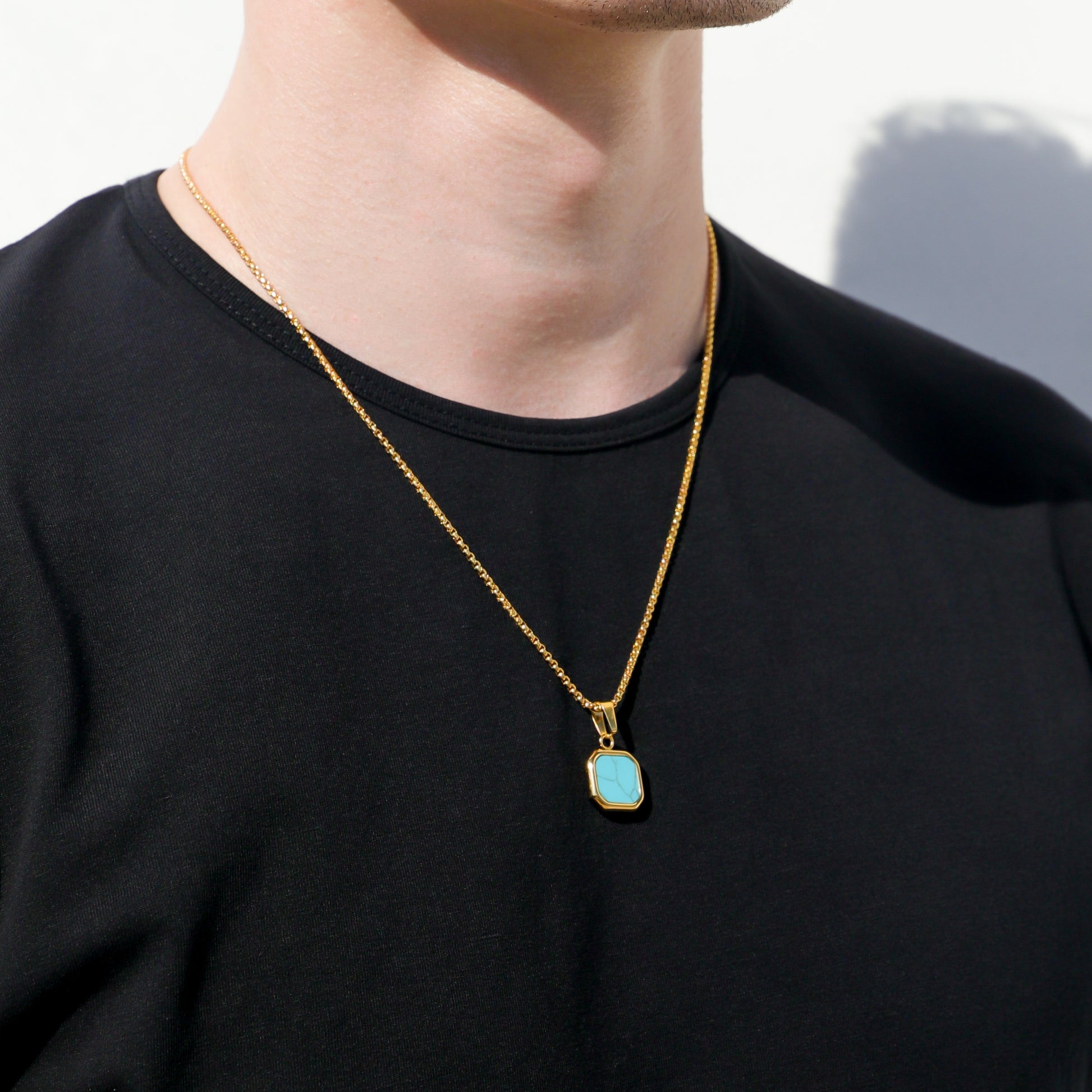This pendant is a true representation of charm and style, combining the radiant allure of gold with the enchanting allure of turquoise. It serves as a stunning accessory that effortlessly elevates any ensemble, whether it's a formal occasion or everyday wear. The combination of the pendant and the round box chain creates a harmonious and captivating composition, making it a cherished addition to your jewelry collection.