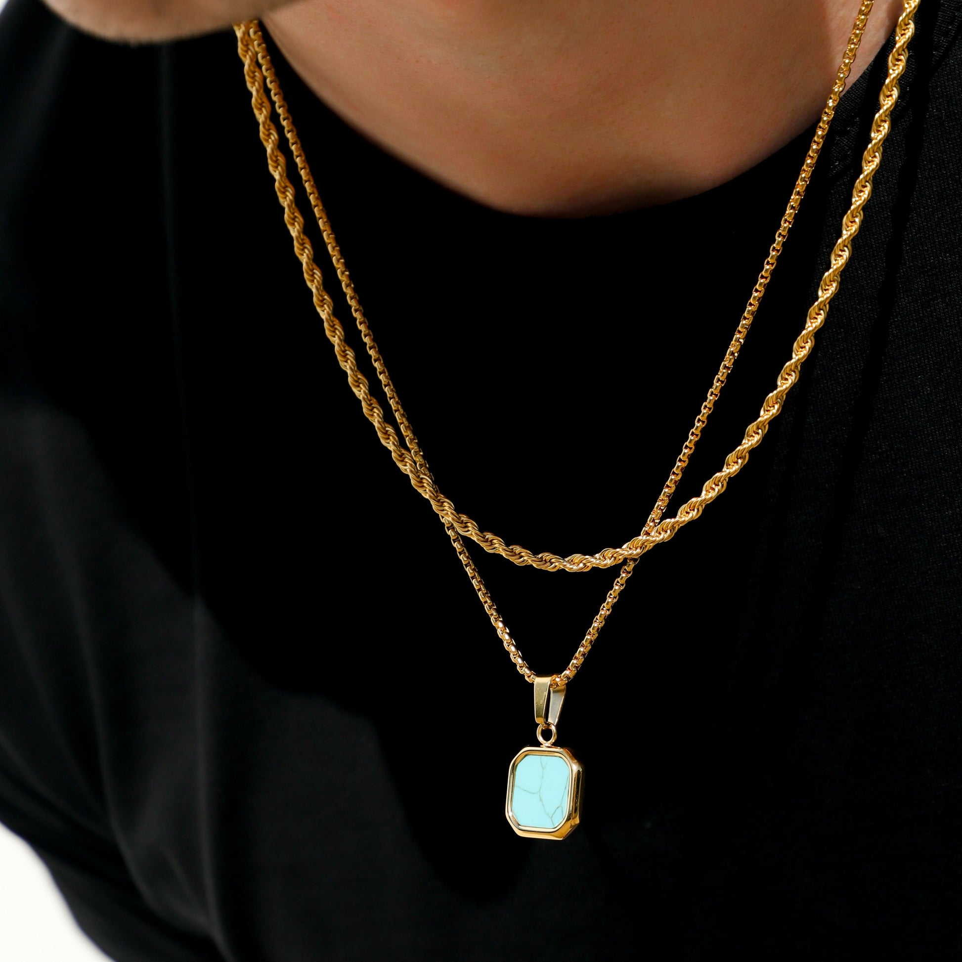 The gold turquoise stone pendant on a gold round box chain is a beautiful and eye-catching piece of jewelry. The pendant features a smooth and polished imitation turquoise stone, known for its captivating blue-green color and unique variations. The stone is carefully set in a luxurious gold bezel, accentuating its natural beauty and adding a touch of elegance.