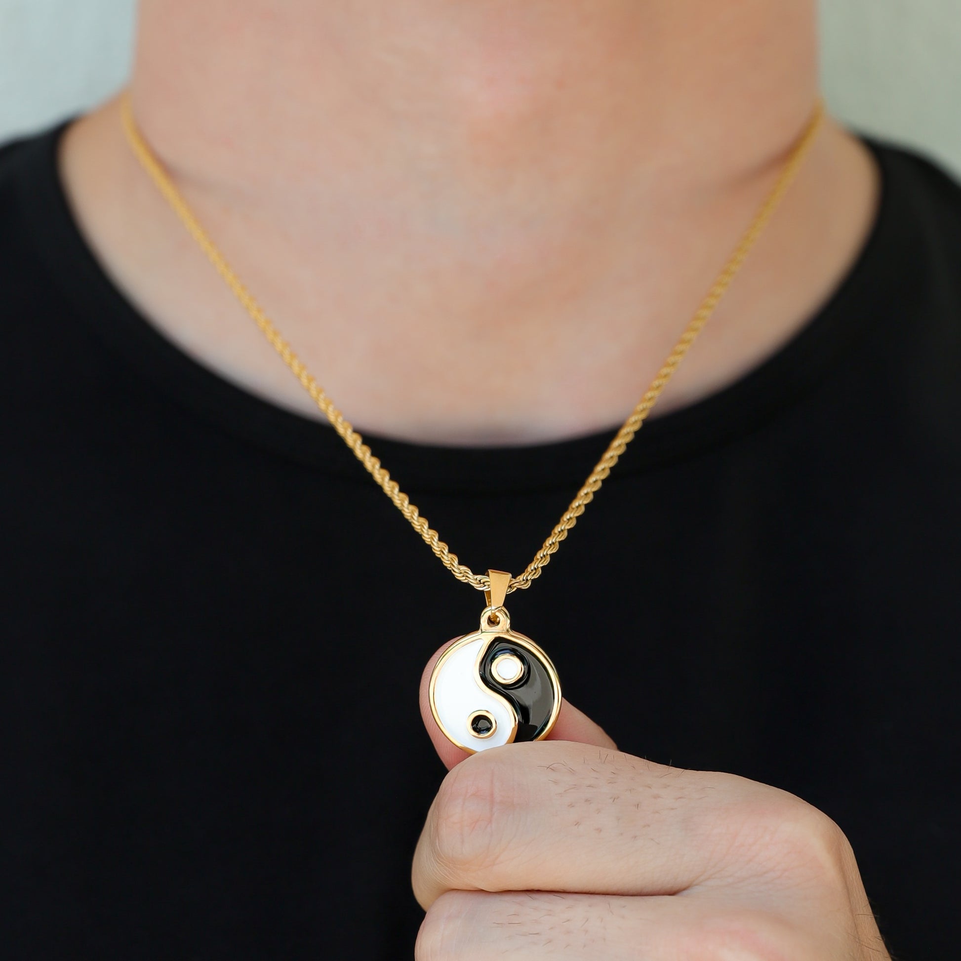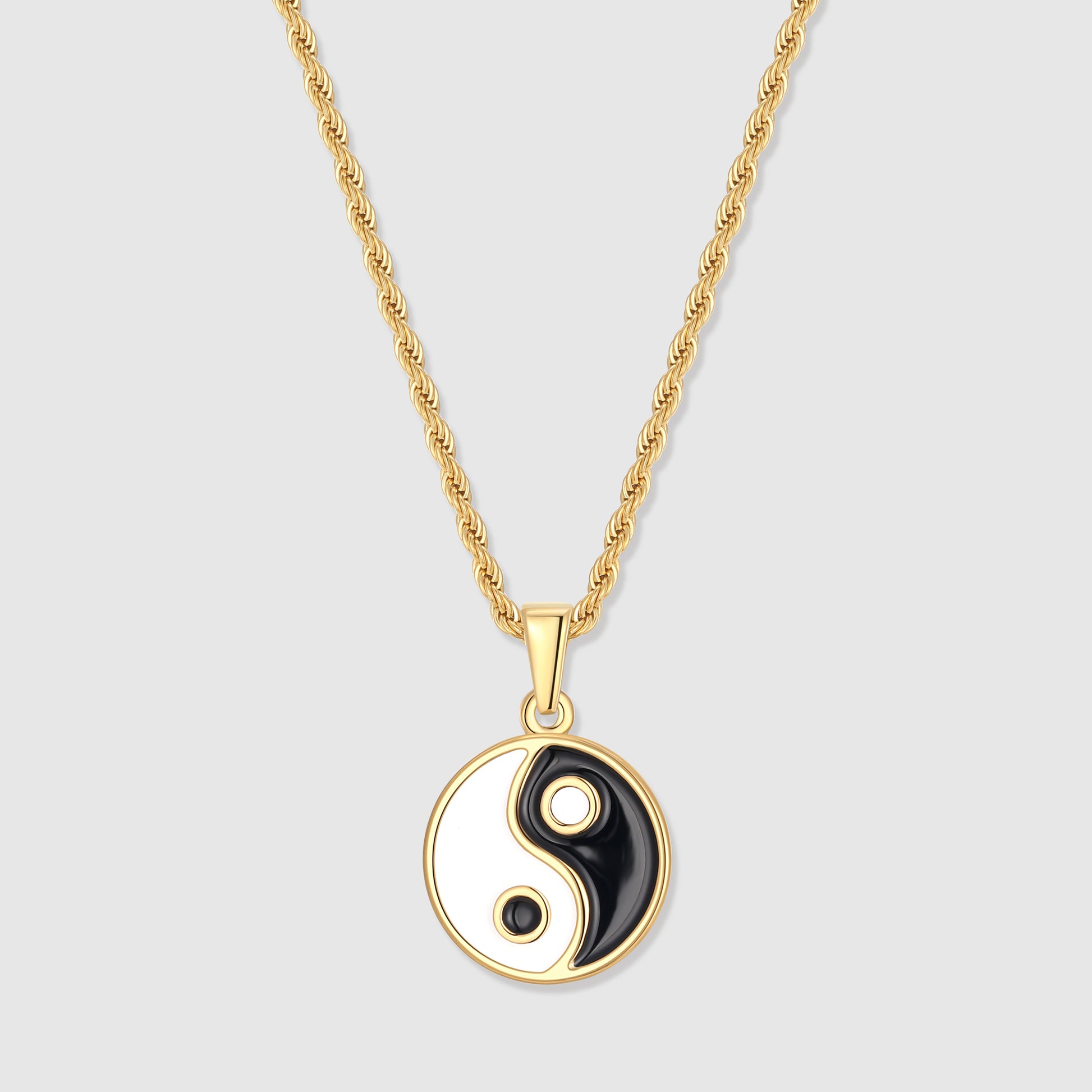 Embrace balance and harmony with this stunning gold yin yang necklace. The pendant features a striking gold design with contrasting black and white enamel, symbolizing the perfect equilibrium between opposing forces. This piece seamlessly blends traditional symbolism with contemporary style, making it a versatile addition to any jewelry collection.